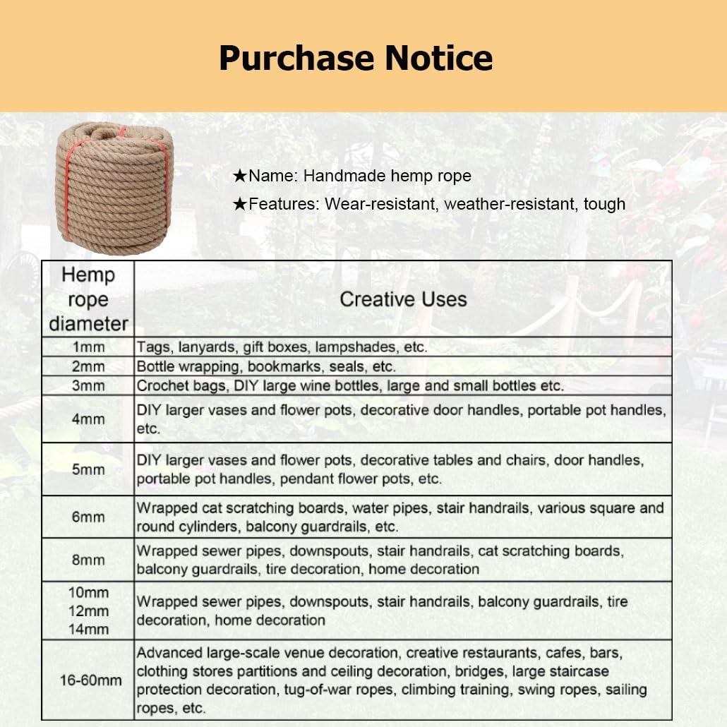Are you still looking for a versatile hemp rope?Our natural hemp rope is hand-woven from natural jute fibers, it is soft and strong, tough and weatherproof, it can withstand various harsh environments; It comes in a variety of sizes and specifications to meet your different needsSpecificationName: Natural Hemp RopeMaterial: Natural Jute FibersDiameter: 12-60mmFeatures: Soft, strong, weather-resistant, weather-resistant, high temperature resistant, wear-resistant, and tough temperature resistance, wear resistance, good toughness, soft rope, strong and sturdyApplications: Indoors, it can be used for crafts, cat scratching posts, landscaping, home decoration, vintage room decor, stairwell decoration, and more; Outdoors, it can be used for scenes such as tug of war, hanging flower baskets, gardening, swing bed suspensions, camping, seawall fencing, posts on docks,thick rope outdoor bar projects, hanging pictures on walls, and many othersCustomized services availableFeatures1. This twisted manila rope is weatherproof and has strong weather resistance2. The jute rope can be easily cut to any length, making it convenient for use in a variety of projects and applications.3. The hemp rope is soft and easy to tie4. This multifunctional rope is made of natural jute fiber, which is strong and toughPackage Includes:1 x Jute Rope Please note:1. Manual measurement may result in an error of 1-3 cm, please understand2. Due to different lighting and displays, there may be visual color differences, please refer to the actual product3. If there is a slight smell, it is normal and will disappear within two to three days4. The hemp rope will shrink 3%-5% when exposed to water; If you plan to use it outdoors, please take this into consideration